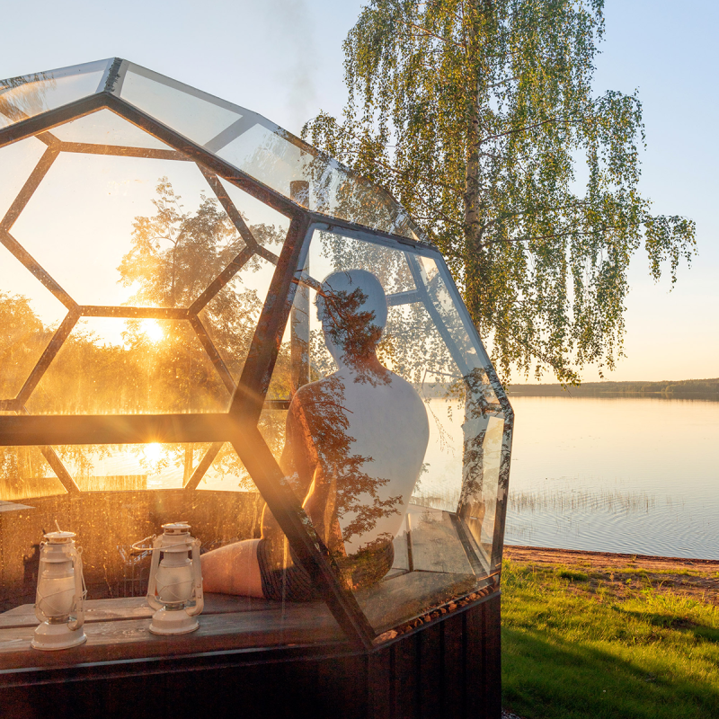 Revontuli Resort at Hankasalmi offers relaxing experiences in the middle of nature. You can even get close to nature in a sauna –the glass-walled igloo sauna lets you admire the sunset from the warmth of the sauna or from the outdoor jacuzzi. The destination also has sauna evenings open to everyone and larger saunas for rent for groups or holiday parties. If you wish, you can also continue the igloo theme by staying overnight in a glass igloo. https://www.revontuli.fi/en/sauna-eng/