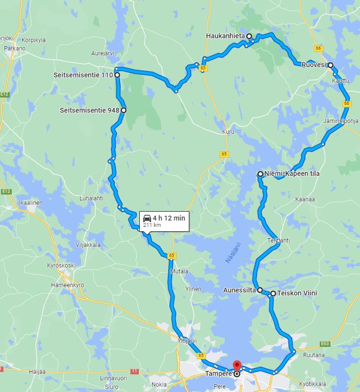 Matka takaisin Tampereelle jatkuu etelää kohti Näsijärven itäpuolta. Tie kiertelee perinteisissä maalaismaisemissa järven välkkyessä välillä puiden välistä. Kämmenniemessä kannattaa pysähtyä vielä ottamaan reissukuvat Pohjoismaiden pisimmän sisämaavuonon ylittävällä Aunessillalla ja hakea tuliaiset Teiskon Viinin viinikioskista, jonka valikoimissa palkittuja marjaviinejä ja myös alkoholittomia vaihtoehtoja. https://www.teiskonviini.fi/