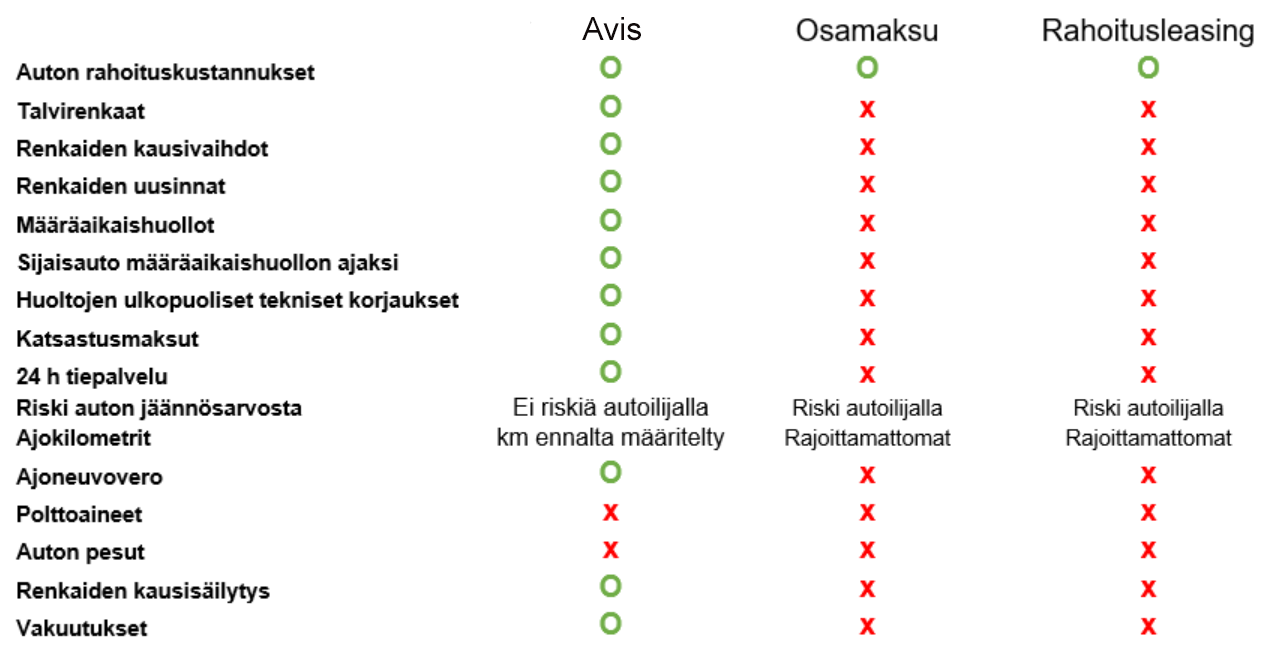 Hinta sisältää kaiken paitsi polttoaineen ja auton pesun. Ei piilokuluja. Sinun ei tarvitse murehtia autohuolloista, katsastuksista, vakuutuksista, renkaiden vaihdoista tai siitä, jos autoon tulee jokin vika: saat sijaisauton korjauksen ajaksi.